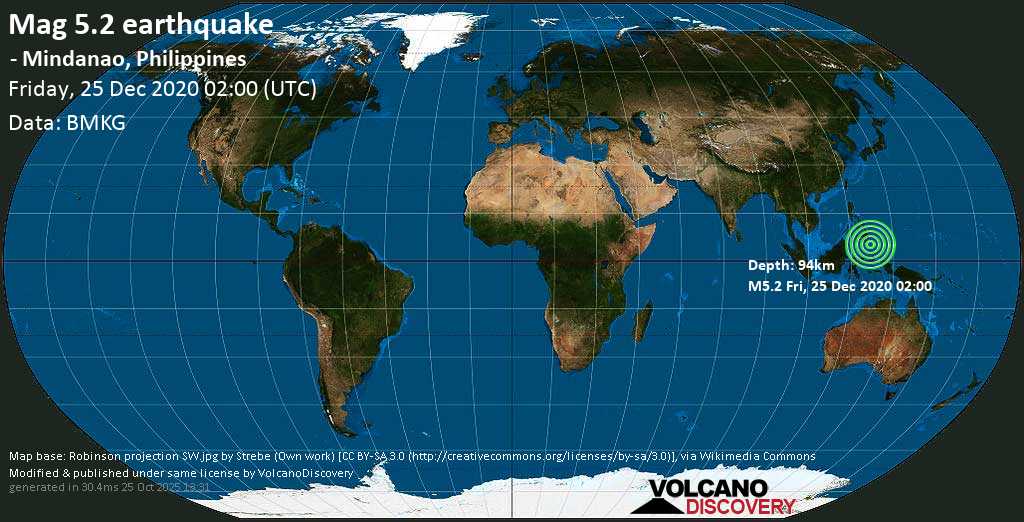 Quake Info Moderate Mag 5 2 Earthquake Philippines Sea 89 Km East Of Sarangani Davao Occidental Philippines On Friday 25 Dec 2020 10 00 Am Gmt 8 6 User Experience Reports Volcanodiscovery